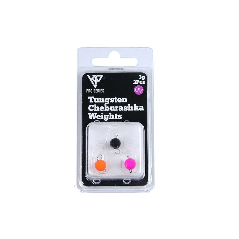 Die Tungsten Chebus von K.P sind in zwei unterschiedlichen Sets erhältlich. Einmal die natürliche Variante bestehend aus Plain, Silber und Gold (in der 2er Packung dann nur Plain und Gold) einmal die UV Variante mit UV Pink, UV Orange und Schwarz (in der 2er Packung Schwarz und Orange). Die Chebus können mit verschiedenen Haken genutzt werden und sind im praktischen Blister verpackt.