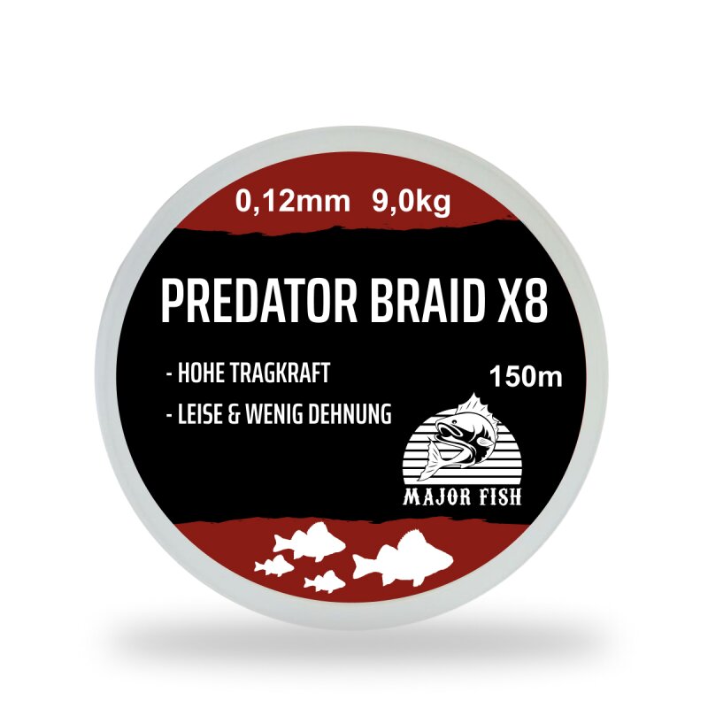 Die Major Fish Predator Braid ist eine hochwertige, 8fach geflochtene Angelschnur zum Spinnfischen im Süßwasser und Salzwasser. Die Farbe Bloodred ist vom Angler gut zu sehen und hat unter Wasser jedoch eine geringere Scheuchwirkung