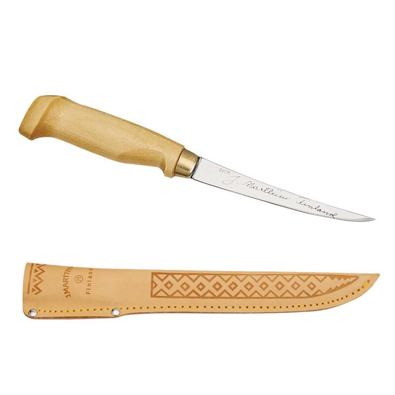 Hochwertiges Filetiermesser von Marttiini mit edler Lederscheide. In der Lederscheide befindet sich ein Kunststoffeinsatz der ein Durchstechen des Messers durch die Scheide verhindert. Die Klinge des Filetiermessers besteht aus rostfreiem Chromstahl und der Griff aus Birkenholz. Das Filetiermesser ist flexibel und lässt sich ausgezeichnet nachschleifen.