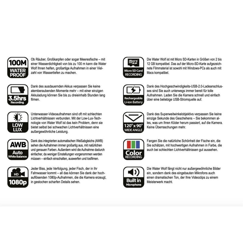 - Full HD 1080P Video - automatischer Weißabgleich - hervorragende Leistung bei schlechten Sichtverhältnissen - wasserdicht bis zu 100 Meter - hohe Stoßfestigkeit - perfekt zum Schleppangeln und Werfen - super wackelfreie Rückholaktion - bis zu 3 Stunden Aufnahmekapazität